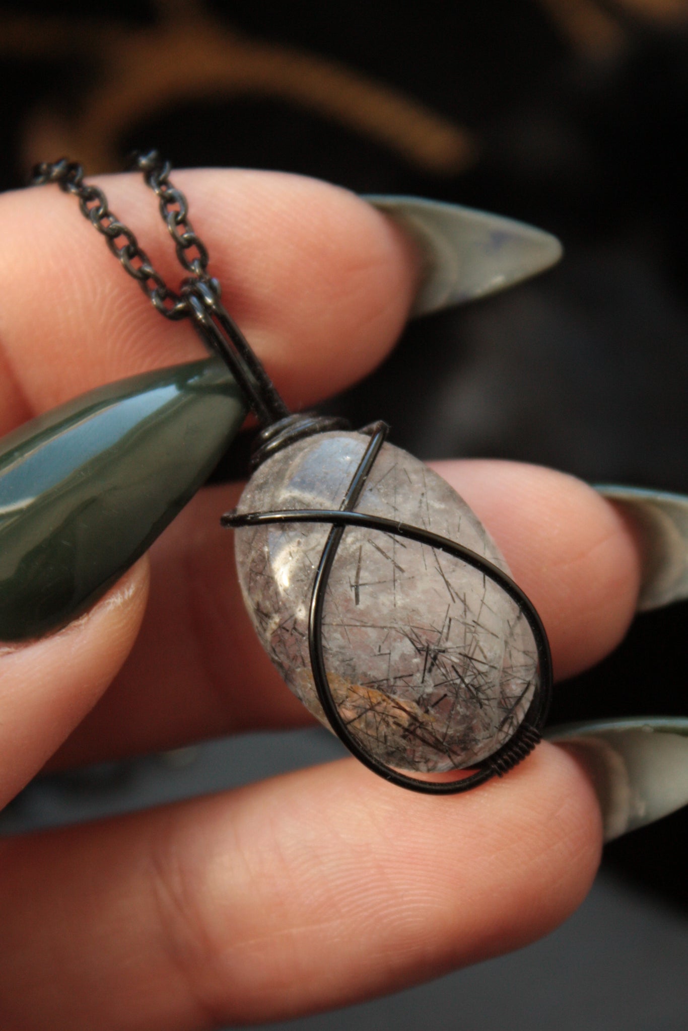 This pendant is handmade with black copper wire and comes with a 45cm stainless steel chain.